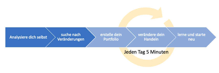 Der Check-In hat 5 Schritte. “Analysiere dich selbst”, “suche nach Veränderungen”, “erstelle dein Portfolio”, “verändere dein Handeln” und “lerne und starte neu.”