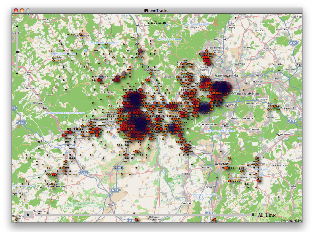 If you’re a proud owner of an iPhone or iPad just like me, you might find it pretty interesting to know that these fancy devices store location based data. I don’t want to start a discussion about security and integrity of this method but if you want to have a look at what data is being stored, you can. On the O’Reilly radar there is a post about a little tool written by Pete Warden which allows you to create a graphical presentation of all the places you’ve been and brought your iPhone to. Seems like a whole lot of data is being stored as you can see on the screenshot below:
