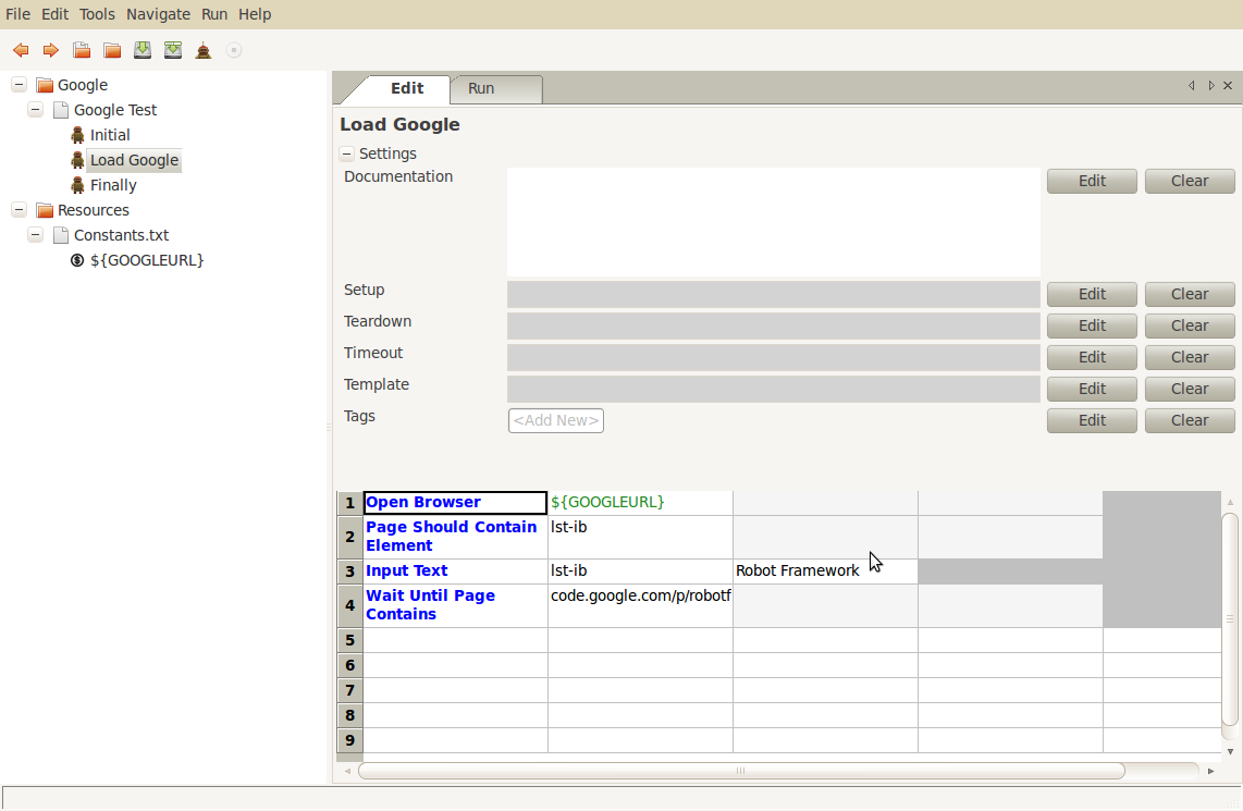 Now, we’re going to create our basic testing. Therefore I’m going to use a number of keywords implemented in the Selenium library. A documentation about these keywords may be found here: http://robotframework-seleniumlibrary.googlecode.com/hg/doc/SeleniumLibrary.html?r=2.7 Of course you may create your own keywords.