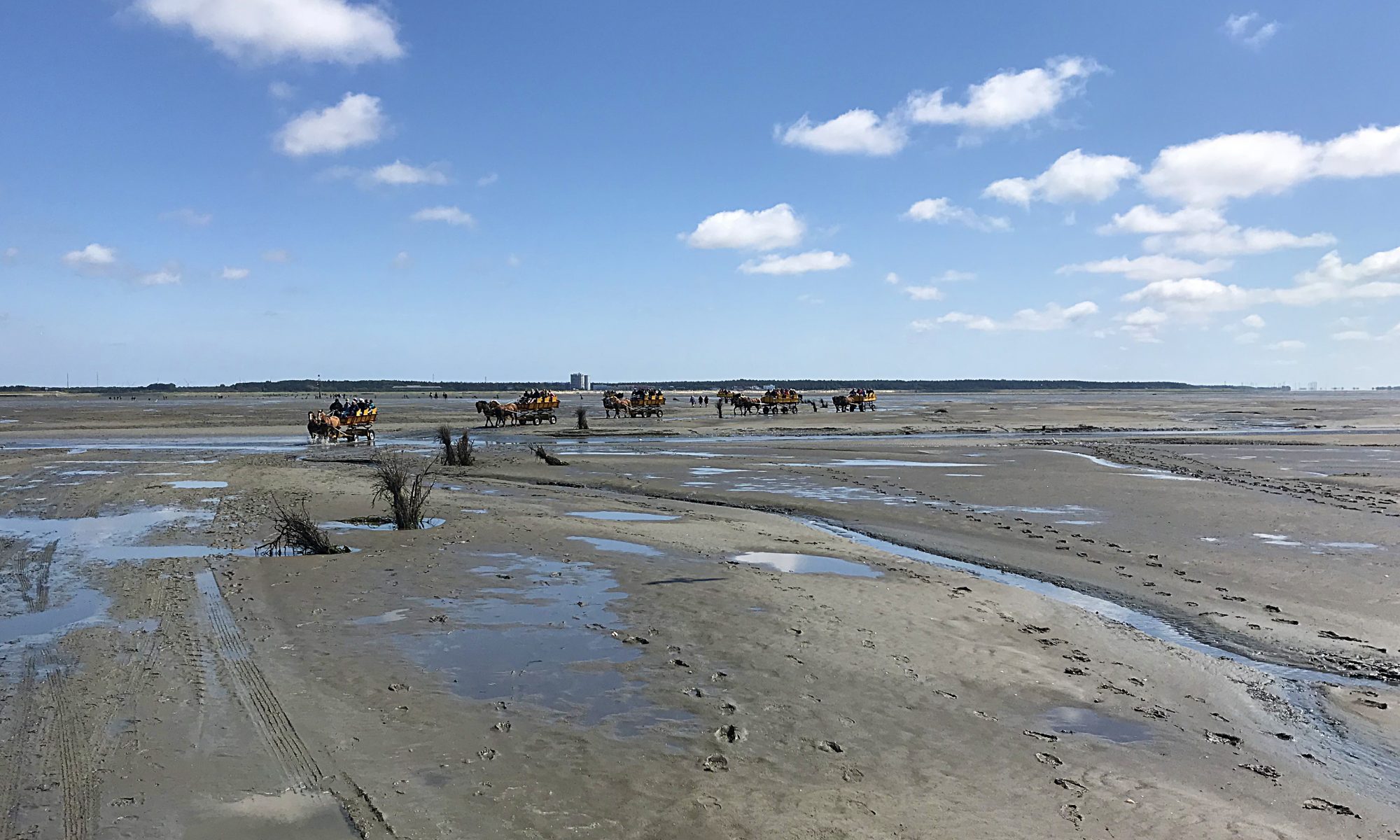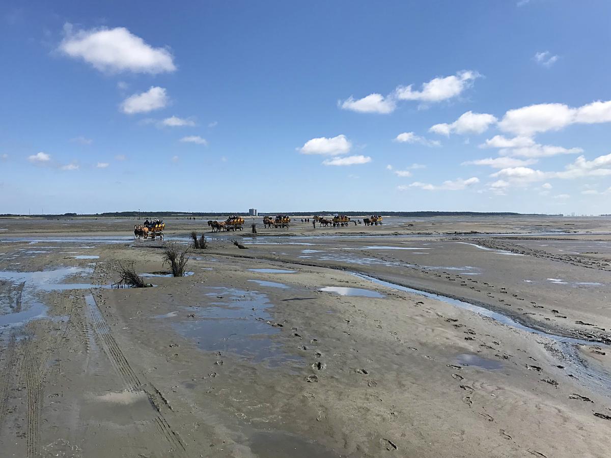 Zurück ging es ebenfalls per Wagen. Kurz vor Sahlenburg gibt es einen tiefen Priel. Der Westwind war so stark, dass nicht klar war, ob wir überhaupt durchfahren können. Gut, dass von der anderen Seite jemand mutig war und es versuchte. Nach dieser Vorhut haben wir uns auch getraut und sind mit dem Gepäck auf den Knien und nassen Füßen von Pferden, die gerade noch aus dem Wasser schauen konnten, sicher in Sahlenburg angekommen.