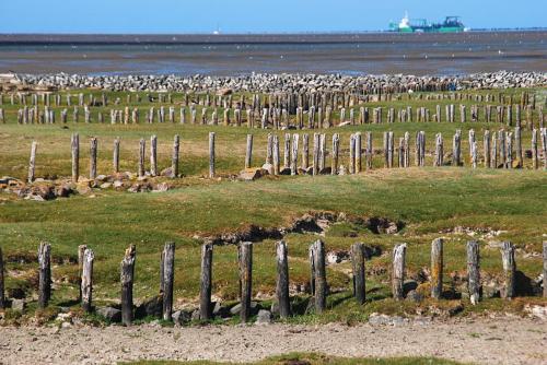 Spricht man mit den Einheimischen, so nennen sie diesen Priel Sorgenkind. Seit der Weserspülung vor einigen Jahren hat die Strömung stark zugenommen. Wenn es so weiterginge, drohe hier menschlicher Eingriff. Diesen gibt es einige hundert Meter weiter zu bewundern. Nach der letzten Elbvertiefung wurde laut meinem Gesprächspartner ein Priel so tief und breit und die Fließgeschwindigkeit nahm derart zu, dass nun mitten im Watt eine kleine Staustufe gebaut ist, um den Priel im Zaum zu halten. Mit dem Wagen poltert man hier über Schotter. Mitten im Watt. Die Elbe soll nun wieder vertieft werden. Bleibt abzuwarten, ob dies Auswirkungen haben wird.