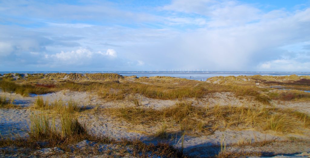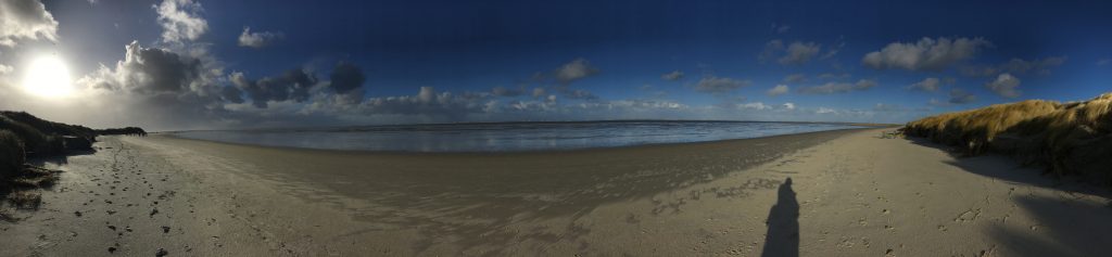 In der Ferne, auf der anderen Seite der sichelförmigen Sandbank, machen es sich Seehunde bequem und trotzen Wind und Kälte. Ein wunderschöner Anblick. Der Wind ist eisig, aber die Sonne scheint. Und so lassen wir uns, eingepackt mit Schal, Mütze und Handschuhen, den Strand entlang treiben und schlendern, links das Meer und rechts die Dünen, am äußersten Rand der Insel entlang.