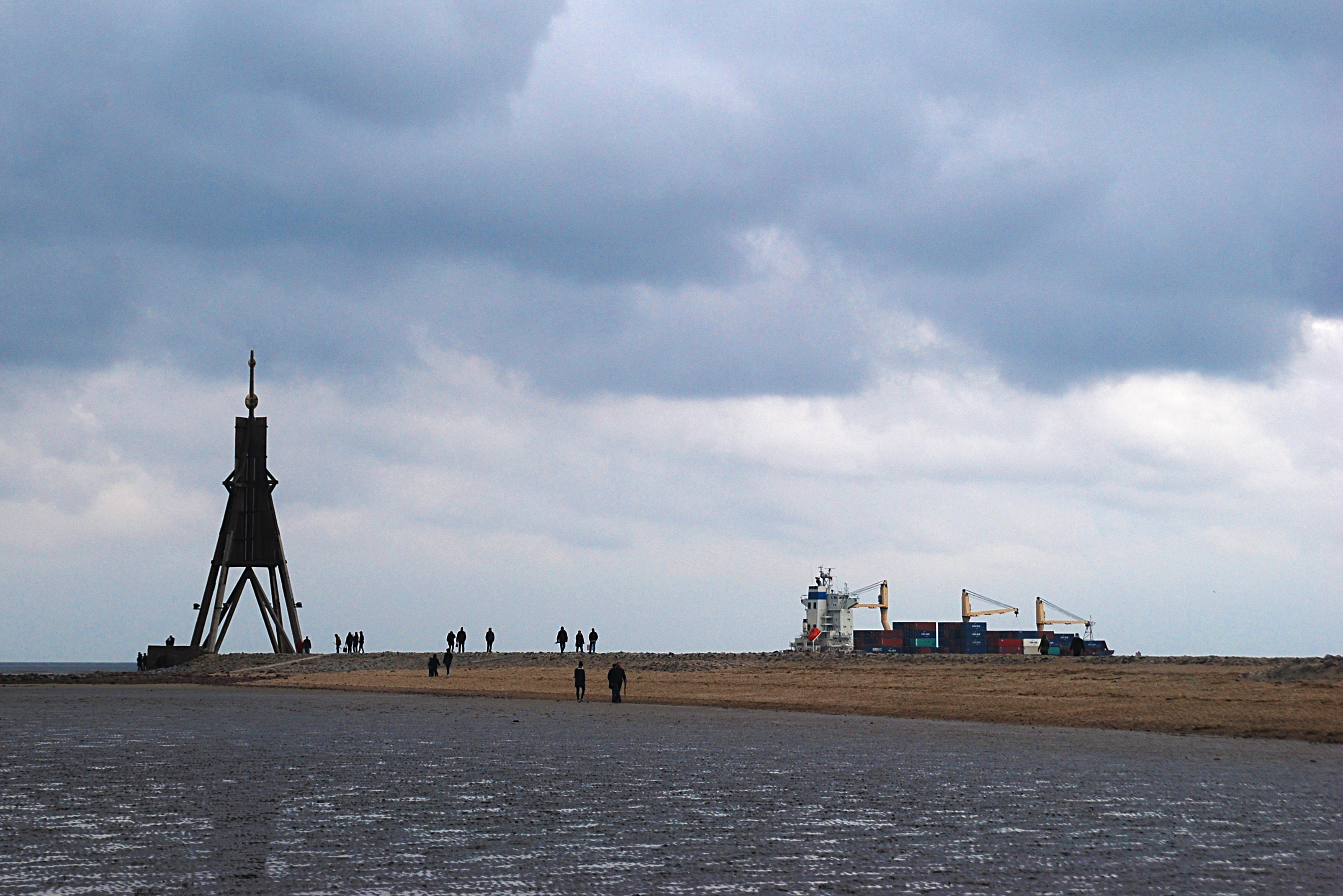 Ganz im Osten endet der Strand an der Kugelbake von Cuxhaven. Wer hier im Wind steht, hat rechts den Blick die Elbe entlang, links die offene Nordsee. Ein windiger Ort.