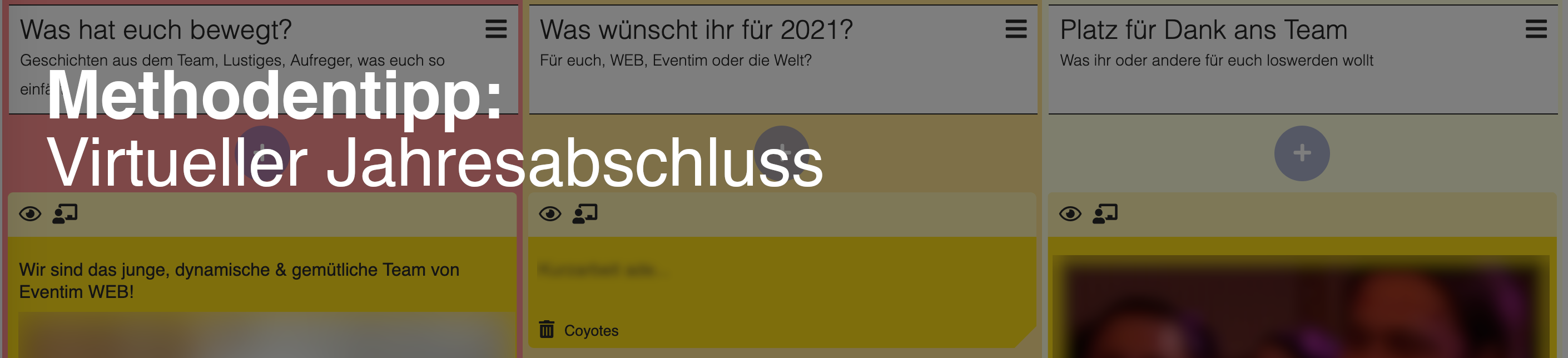Heute habe ich einen Methodentipp für euch, um gemeinsam mit euren Teams einen schönen, virtuellen Jahresabschluss zu finden. Wir haben dies heute veranstaltet und uns eine Stunde mit 45 Menschen dafür genommen. Unsere Teams haben sich in den letzten neun Monaten kaum bis gar nicht gesehen. Sie haben zwar viele fachliche und technologische Schnittstellen, das gemeinsame Zusammenkommen zu größeren, sozialen und virtuellen Veranstaltungen jenseits von vielen Angeboten innerhalb des eigenen Teams kam aber zu kurz.