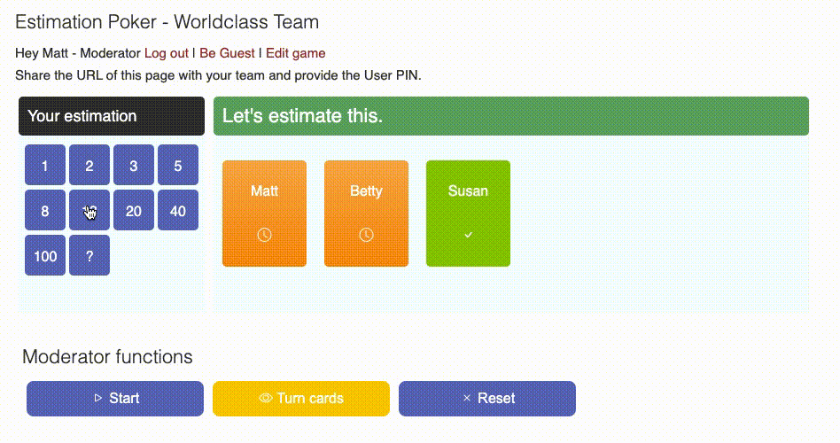 Easy and simple Estimation Poker Tool for Scrum Teams. For estimation sessions with distributed teams. No registration required.